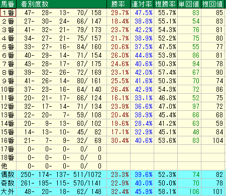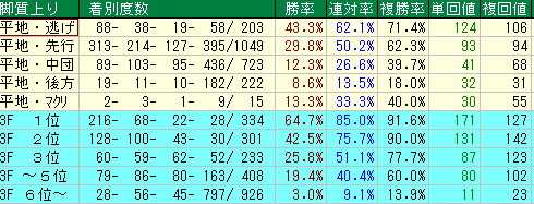 - 「1300m」の隠れた複勝期待値! サンプルは少ないものの、複勝回収値122をマーク。勝率は低いですが、2〜3着に突っ込んでくる確率は7割を超えており、ヒモ荒れを狙う際の軸に最適です。