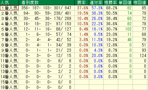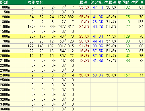 - 2000m:単勝回収値42。 複勝率は高いですが、勝ち切る確率が相対的に低く、過剰人気になりやすい「危険な人気馬」になりがちな距離です。