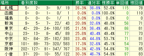 - 札幌競馬場:勝率26.3%、単勝回収値115。 遠征してくる川田騎手はまさに「確勝」の構え。単勝回収値が100を超えており、馬券的にも最も美味しい場所です。