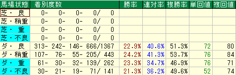 | 馬場状態 | 複勝率 | 複勝回収値 | 評価 |