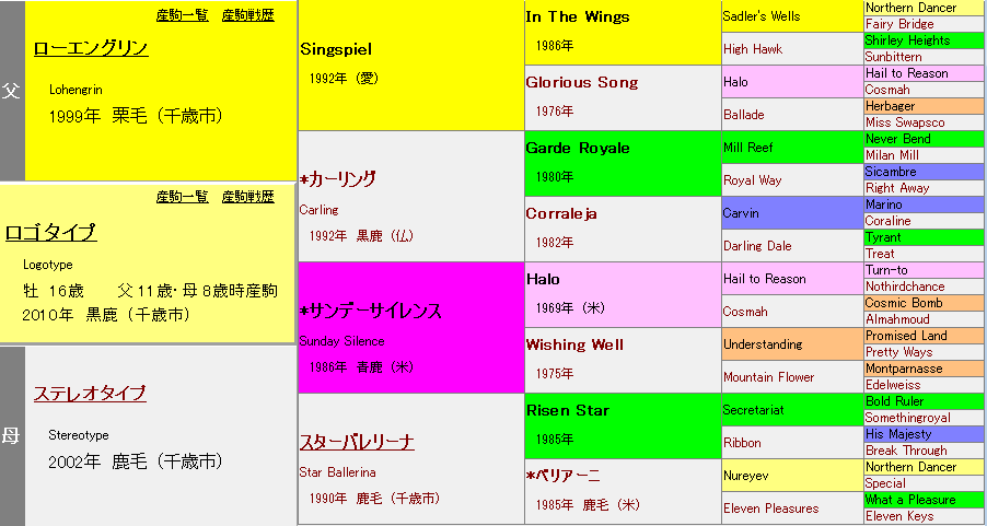 • 3位:タイキシャトル 46戦ありながら勝率は4.3%、単勝回収値は22に留まります。スピードが武器のシャトル血統ですが、ロゴタイプとの配合では中途半端な結果になりやすい傾向にあります。
