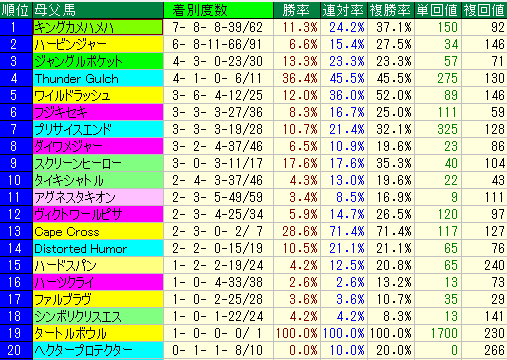 • 1位:Thunder Gulch(サンダーガルチ) 勝率36.4%、複勝率45.5%という驚異的な安定感を誇り、単勝回収値275、複勝回収値130と文句なしのトップです。ロゴタイプのパワーに米国的なスピードと粘りが加わり、信頼度は極めて高いと言えます。