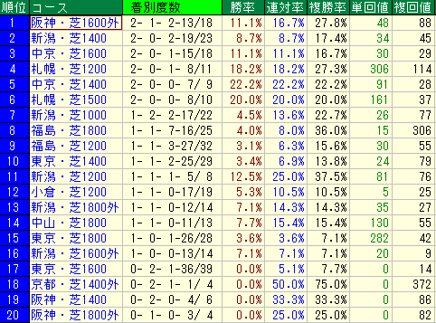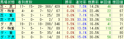 • 種牡馬データ(大外): 複勝率 15.4% / 複勝回収値 42