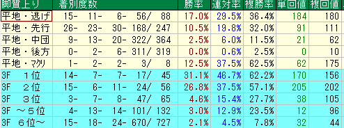 2. 「上がり2位」を記録できる先行馬を狙え! 最速のキレは不要。前目から上がり2位の脚を使える馬がいれば、複勝回収値202の恩恵をフルに受けられます。