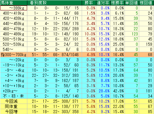 3. 「マイナス体重」より「プラス体重」を歓迎せよ! 今回増(複勝回収値85)の方が、今回減(複勝回収値65)よりも馬券的な期待値は高いです。使い詰めでの馬体減りはこの血統にとって最大の敵。ゆとりある馬体での出走こそが買いのサインです。