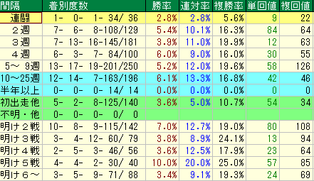 出走間隔別で見ると、リフレッシュ効果が数字にハッキリと表れています。
