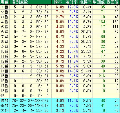 1.馬番別適性:狙い目は「中番」、内番は意外な苦戦