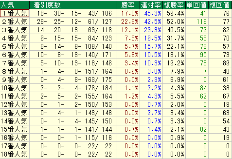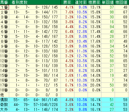 • 鉄則2:外目の「偶数番」を狙い撃て。16番・17番の複勝率 20% 近辺は強力。