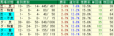 平均の 22.2% には及びませんが、産駒自身の内枠(**13%台)と比較すれば安定しています。判定は平均比で「苦手」**となりますが、揉まれないメリットは大きく、相手候補(ヒモ)としては決して無視できない条件です。