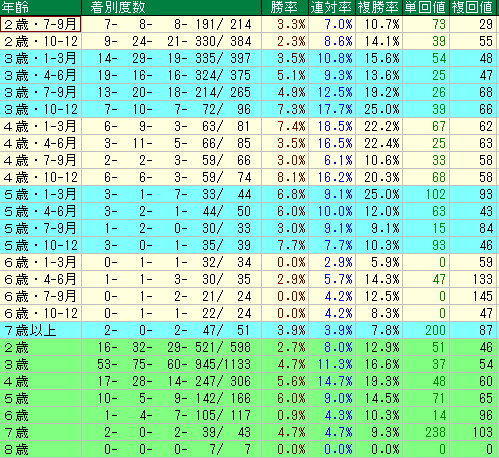 • 6歳(4-9月):勝率は低いですが、複勝回収値が133〜145という驚異的な数値を叩き出しています。