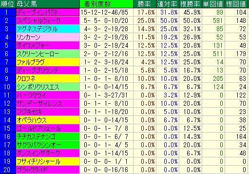 • 産駒データ: 複勝率 11.8% / 複勝回収値 19