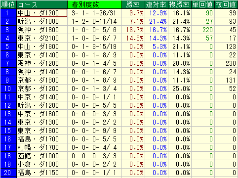 • 評価: 勝率 11.1%、単勝回収値 240、複勝回収値 112