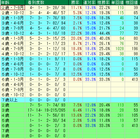 • コメント: 複勝率も 12%〜20% と平均的ですが、とにかく回収率が低いのが特徴。過剰人気になりやすく、馬券的な妙味は全くありません。この時期は「名前で買う」のを控えるべき時期です。