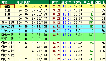 • 明け4戦目: 複勝率 27.6% / 複勝回収値 105