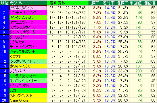 複勝率41.7%、複勝回収値102。勝ち星こそ2勝ですが、複勝率**40%**超えは全母父の中でナンバーワン。とにかく馬券圏内に突っ込んでくる確率が高く、軸馬としての信頼度は群を抜いています。
