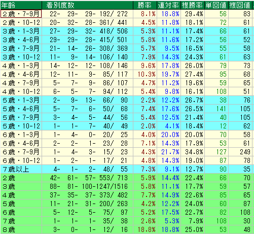 5歳4-6月の単勝回収値は141。さらに7-9月の複勝回収値は105。 この時期の産駒は「終わった馬」と見なされがちですが、実はタフな夏場に強く、人気薄での激走が急増します。