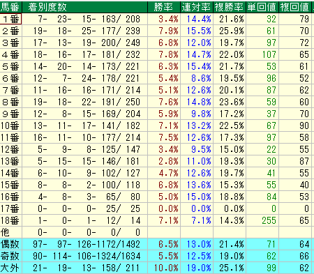 - ブロガーの視点: 内すぎず外すぎずの「中番」でも、平均的な馬に比べると苦戦を強いられています。特に12番の単回収値22は、このゾーンでの勝ち切る力のなさを象徴しています。