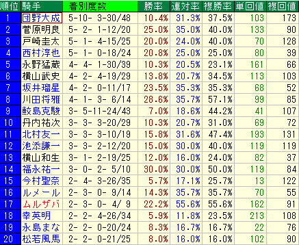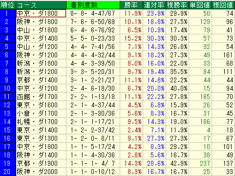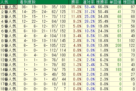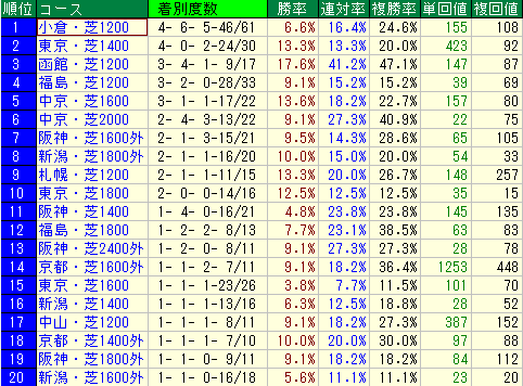 - ただし、単勝回収値36%、複勝回収値69%と、回収値は平均(単勝66%、複勝68%)を下回っています。