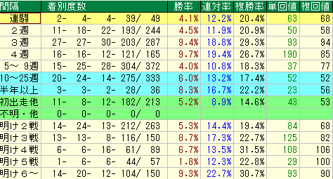 - 明け2戦目は勝率5.3%、複勝率19.4%と平均的。明け5戦目は勝率1.8%と低く、期待薄。