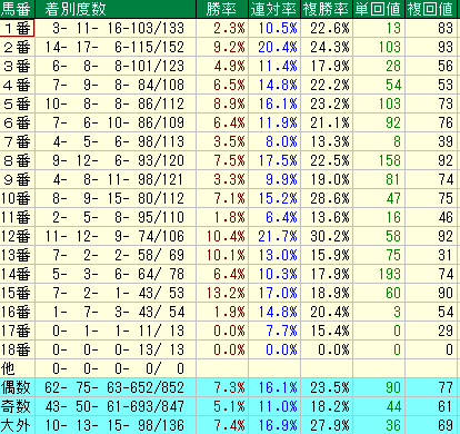 - 産駒複勝率: 13番(15.9%), 14番(17.9%), 15番(18.9%), 16番(20.4%), 17番(15.4%), 18番(0.0%)