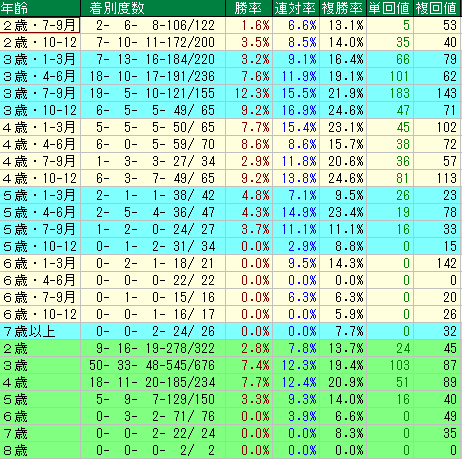 - 【3歳:最大の黄金期!】 ここが勝負どころです。特に**「3歳7-9月」**に注目!勝率12.3%、複勝率21.9%に加え、単勝回収値183、複勝回収値143という驚異的な数値を叩き出します。夏場のローカル開催や、他馬がバテる時期に父譲りのスピードが完全に覚醒します。