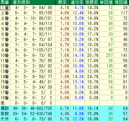 - 偶数番(有利):勝率6.7% / 複勝率18.1% / 単収88 / 複収84