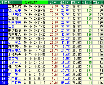 • 分析: 複勝率23.6%、単勝回収値80、複勝回収値75。