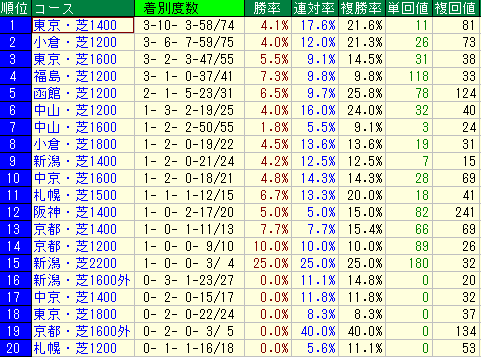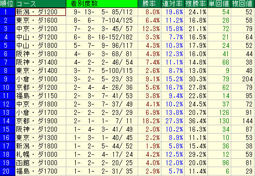 複勝率ベースで順位をつけると、得意な順は以下の通りです。