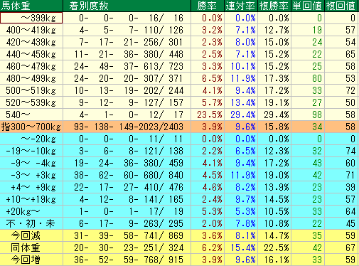 - 540kgを超えるような巨漢馬がいれば、単勝の爆弾候補として注視。