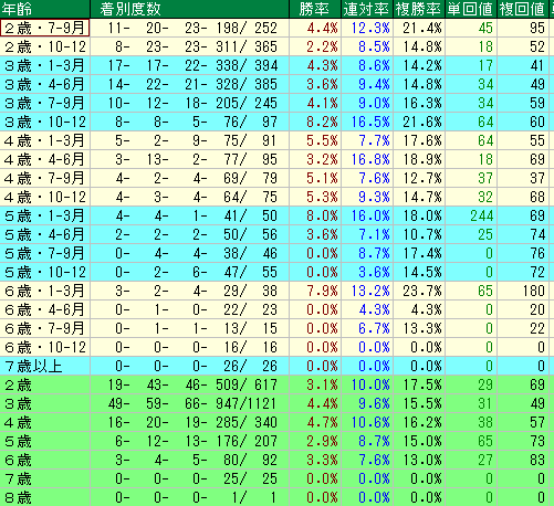- 【5歳・6歳】:驚異の「老け込まない」底力 特筆すべきは5歳1-3月の単勝回収値244、そして6歳1-3月の複勝回収値180です。年齢を重ねてパワーが完成された頃に、人気薄での激走が相次いでいます。