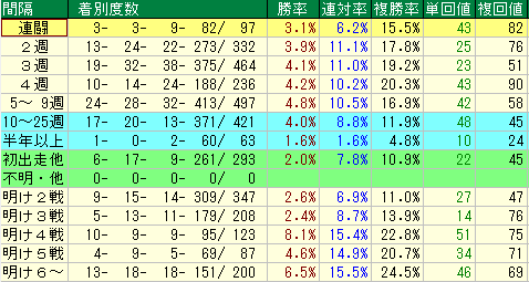 - 「中3〜4週」で継続して使われている馬を狙え! タフな産駒ゆえに、適度な間隔でコンスタントに使われている時が一番安定します。