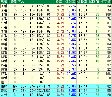 - 外番(13~18番):【苦手】距離ロスが響く傾向 複勝率は**8%~15%**台。平均(16%~19%)を下回っており、外から強引に足を回す競馬はあまり得意ではありません。ただし、17番枠のような超外枠で極稀に大穴(回収値166)を出すことがありますが、基本的には苦戦傾向です。