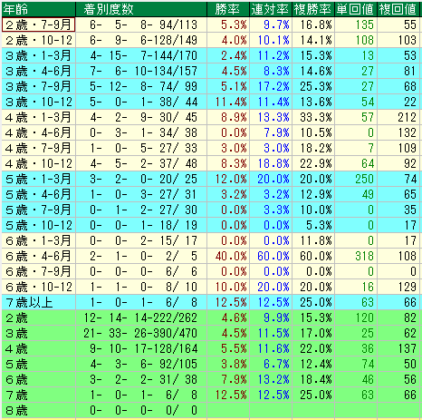 • 評価理由: 5歳初頭は単勝回収値 250、6歳春は単勝回収値 318