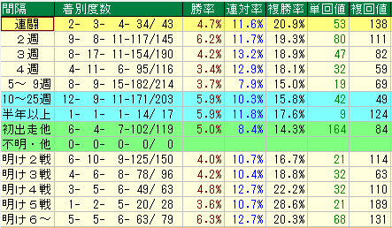 • 2週(中1週): 複勝率 19.3% / 複勝回収値 111