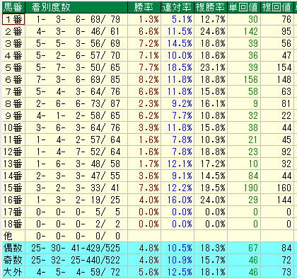 • 奇数番: 複勝率 15.7% / 複勝回収値 72