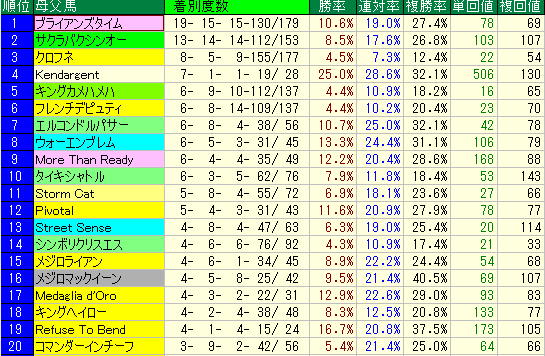 - ウォーエンブレム(前向きな勝負根性) 勝率13.3%、単勝回収値106をマーク。先行して押し切る競馬が得意なこの配合は、馬場状態を問わず高いレベルで安定した利益を運んでくれます。