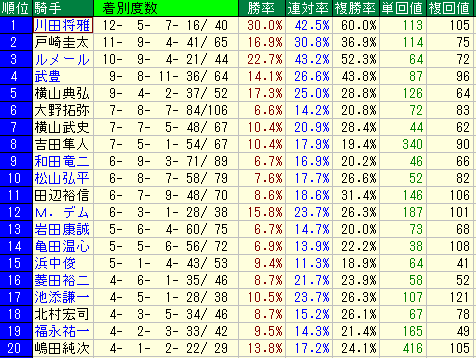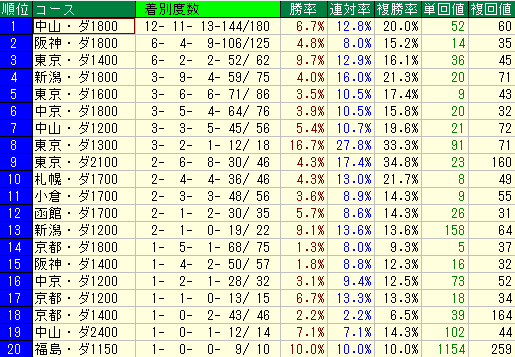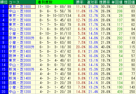 2:得意コース:左回り三場(新潟・中京・東京)での信頼度