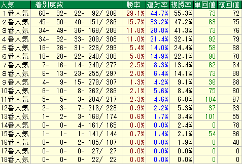 - 中枠(5~12番)の人気馬は「疑え」! 平均以下の的中率となっており、期待値は低めです。
