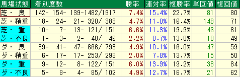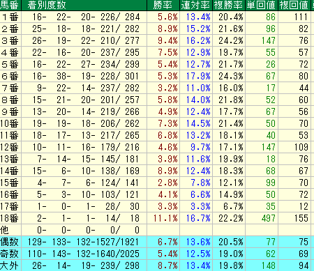 - 複勝率は平均を下回りますが、3番の単勝回収値147、1番の複勝回収値111と、個別の馬番で見ると妙味は十分。砂を被るリスクを考慮しつつも、先行してロスなく回れる内枠はプラスに働きます。