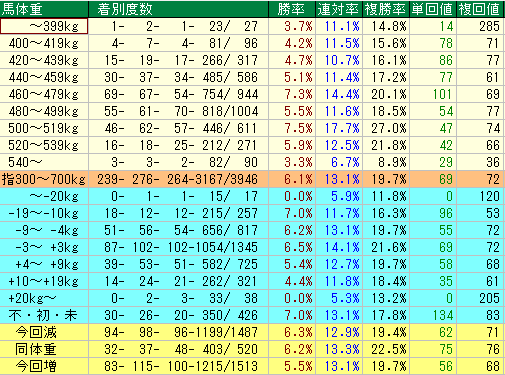 - 複勝率は19.7%とそこまで悪くありませんが、勝率が5.5%、単勝回収値も56まで低下します。プラス体重での出走は、頭(1着)では狙いにくいのが実情です。