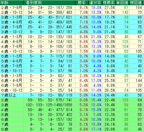 - 【特注穴】6歳・4-6月および10-12月 6歳以降は、特定の時期に異常な高回収率を記録します(4-6月:複回144、10-12月:複回105)。生き残っているベテランの意地に賭けるならこのタイミングです。