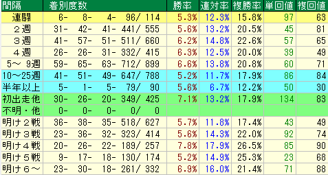 - 複勝率が全間隔の中で最も高く、安定感があります。適度にレースを使いつつ、疲れを残さない絶妙なスパンが中3週です。