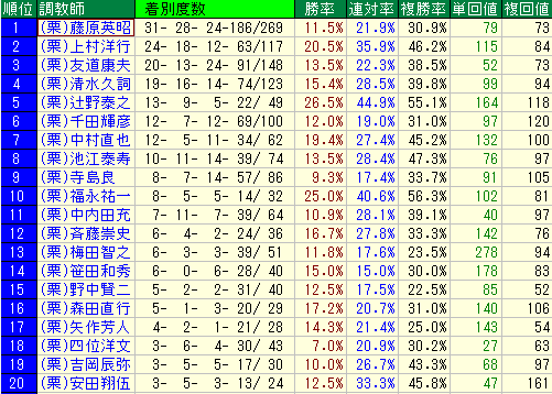- 笹田和秀厩舎 こちらも強烈です。複勝率 30.0% とまずまずの数字に対し、単勝回収値は 178 。勝つ時は鮮やかに突き抜ける傾向があり、単勝勝負にはもってこいのコンビネーションです。