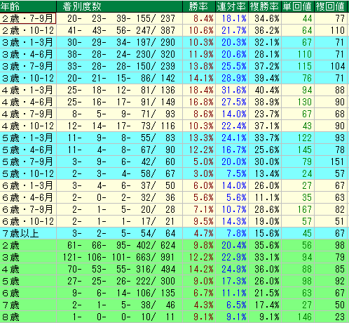 - 4歳・7-9月(夏枯れの罠) 不思議なことに、絶好調な4歳シーズンの中でこの夏場だけは複勝率 23.7% 、単勝回収値 67 と大きく数字を落とします。夏の暑さや遠征など、特定の条件下での4歳馬とは相性が悪い可能性があるため、注意が必要です。