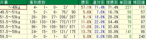 - 59.5kg以上(サンプル1頭の衝撃) わずか1戦のみですが、しっかりと馬券内に持ってきており、複勝回収値は 240。斤量負けをしない精神力と技術が、数字に透けて見えます。