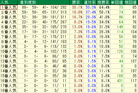 - 東京競馬場 複勝率 27.9%、単勝回収値 62。平均よりは高いものの、府中の長い直線では人気馬を取りこぼすシーンが他場より目立ちます。