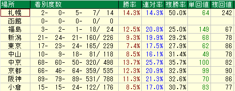 - 「東」なら中山の複勝、札幌の単複! 東京よりも中山の方が複勝率は高く、小回りの捌きを活かして確実に圏内に食い込みます。そして夏競馬の札幌は、見つけた瞬間に「お宝確定」の超特注条件です。