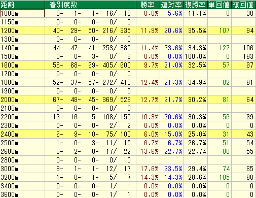 - 2200m 複勝率こそ30%を超えますが、単勝回収値は 56 と低迷。勝ち切るには一歩足りない、ジリ脚になりやすい距離です。