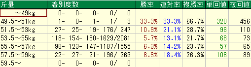 • 【評価:C】53.5kg~57kg(平均斤量) 決して悪くはないのですが、回収期待値が低いため、軸にするなら「確実な裏付け」が欲しいゾーンです。