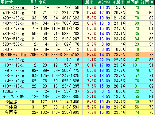 1.馬体重別パフォーマンス:狙い目は「440kg〜519kg」の中〜大型馬!
